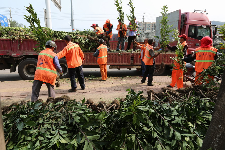 新光路鐵路橋至港城大道段南側綠化帶,因為人為踩踏、車輛碾壓導致綠化斑禿損壞嚴重,為盡快恢復綠化原貌,改善市容市貌。8月18日,裕升、裕欣養護公司組織80多名綠化工,從早上6點一直干到下午6點,卸苗、運苗、挖坑、插苗,烈日酷暑下奮戰一整天,中午在樹陰下吃點盒飯,喝點礦泉水,繼續工作,橘黃色工作被汗水浸透、被烈日烤干,這樣有好幾個來回?!敖裉煳覀円谶@片綠化補植紅葉石楠、金森女貞等模紋小苗1萬余株,紅葉石楠球等灌木110株,有效改善該路段綠化植被,提升城市形象,我們還要在黃海續道補植草坪近30000平方,在這條1000多米長的路段,有車輛維修點50多家,車輛出入,對路邊綠化帶傷害非常大,這一路段也是環衛整治長期存在的‘老大難’,這次,在開發區行政執法部門的配合下,我們要重新種植草坪,對這一‘老大難’路段植被進行恢復,另外德蘭南路、東路補植苗木近80萬元的綠化工程也已開工上土整土,接著要栽苗,根據開發區創衛部署要求,上述這些事情必須在8月底完成,所以說時間相當緊,職工們都冒著高溫,加班加點搶進度?!惫靖笨偨浝碛艉攴逭f。