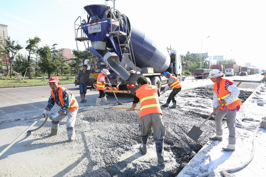 在大港路“新光路至零公里”路段,筆者在水泥路上看到一塊塊被切割成方方正正的凹面,四周都架好防護欄等安全防護設施,在華東城北門偏東不遠處,一臺挖掘機的鏟斗被換上沖擊破碎錘,正在一大塊破損的水泥路面沖擊破碎作業,“嗒嗒嗒”的沖擊聲十分震耳。在與現場作業的盛達市政公司市政維修項目部副主任史如勤交流中得知,該路段是附近集團箱基站進出港口集裝箱車輛的重要通道,每天有好幾百輛集裝箱車輛進出,水泥路面不堪重負,損壞比較嚴重,根據開發區創衛工作要求,由他們對該路段破損處進行局面分割維修,整個路段維修面積達到5000多平方,為保證道路使用通行,采取半幅維修、邊破碎邊澆灌的方式,保證施工進度,現正在維修北側路面,整個路面維修計劃在8月底完成。“因為創衛,我們下一步還要對轄區內的破損、歪到的路牙石進行維修扶正,242路段瀝青破損路面維護,還要開通四處道口,而現在事多人少,人手比較緊張,我們周六周日都沒有休息,就是想把創衛工作任務一項一項地及時完成,決不能拖創衛工作后腿?!彼呎f邊用肩上的毛巾擦著額頭上的汗水。