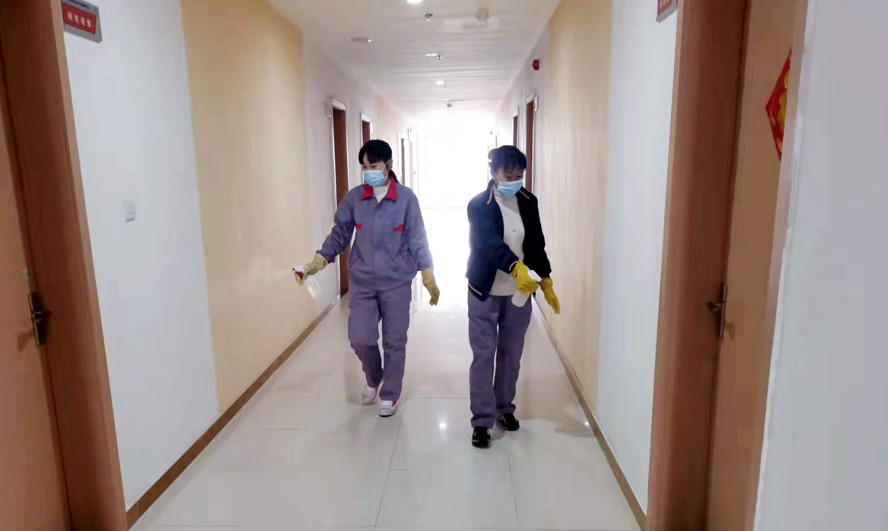 干凈整潔的辦公樓、宿舍樓里飄著淡淡的消毒水味道,清瘦干練的保潔員任禮勤正在仔細地打掃著樓道。5號疫情突發之時她正好當班,根據以往疫情經驗,她果斷地把一直照料著的年邁母親安排給了大哥,此后便堅守在工作崗位上。疫情防控期間的工作量增加了不少,每天她和同事們分片作業,在認真做好各自清潔區每日兩次的保潔、消毒工作的同時,還要負責就餐人員一日三餐的登記、測量體溫等工作。每天從早上7點開始,5位保潔員的身影便忙碌在公司的門廳、餐廳、樓道、電梯等場所,這一忙常常要到晚上6點多。“請您量下體溫”“今天你做核檢了嗎”,這些溫馨的話語幾乎成了她們對大家的問候語。