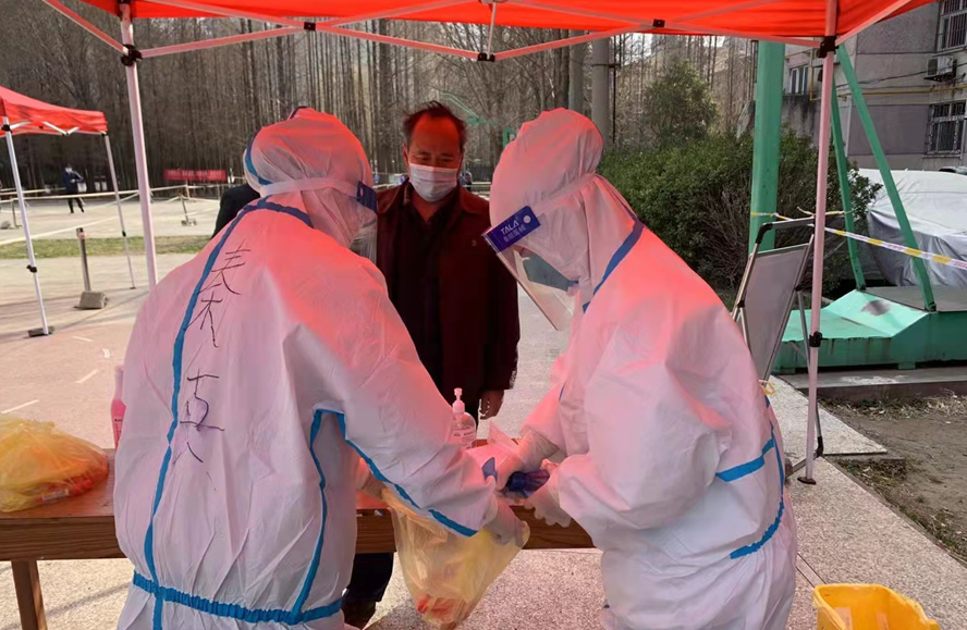 然而隨著疫情愈發嚴重,小區核酸檢測員人手又緊張了起來,“我可以,這幾天我都學會了,最基本的我都會”秦英又是第一個舉手到最前線。這下她更忙了,每天凌晨三點起床做飯,五點社區報到,一直堅守到晚上八點。為了節省防護服,她一般都要等到中午2點多鐘才休息吃飯,這股毅力讓社區、街道領導看在眼里、服在心上,連一直牢騷怪話的幾個群眾也為她由衷地豎起大拇指。