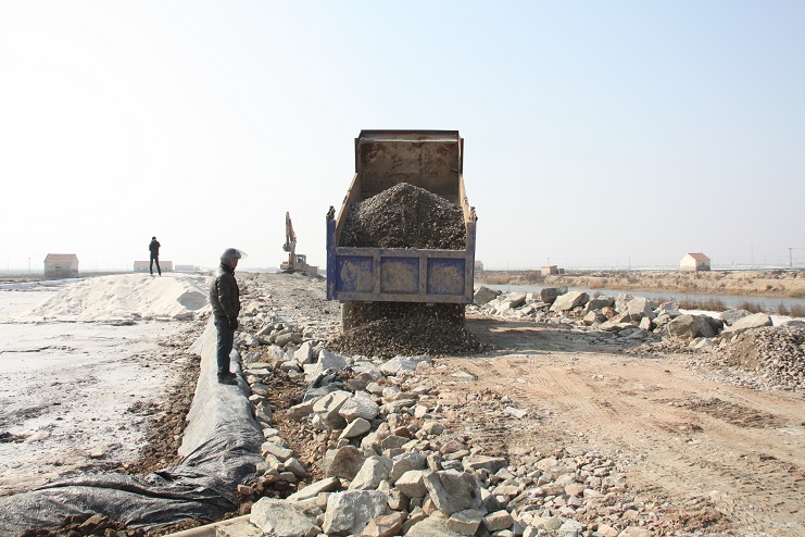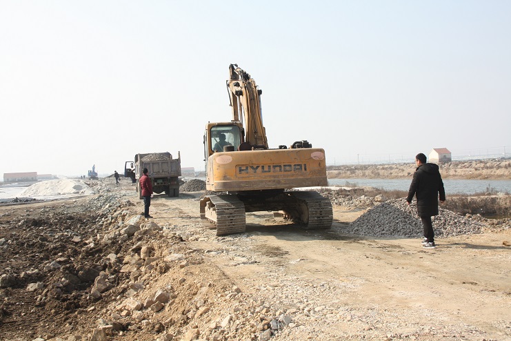 2月15日,在新河制鹽公司七至十班運鹽路施工現場,我們看到南翼公司項目工程分公司的員工正在指揮兩臺小型工程車將石子傾倒在路基上,兩臺挖掘機正忙于將運送來的石子整平。運鹽河對面,三輛滿載土夾石的大型工程車一字排開,正等待卸載。據了解,目前正在施工的是新河制鹽分公司二期運鹽路維修改造工程,該工程改造路段全長3300米,計劃總投資193萬元,其中路基鋪設部分由日曬制鹽公司出資45萬元,路面部分則由縣交通局承擔,預計需要投入148萬元。該工程于去年底開始施工,預計三月中下旬全部鋪設完成。另外新河制鹽分公司一期一至十二班3300米運鹽路改造工程計劃將于今年下半年實施。