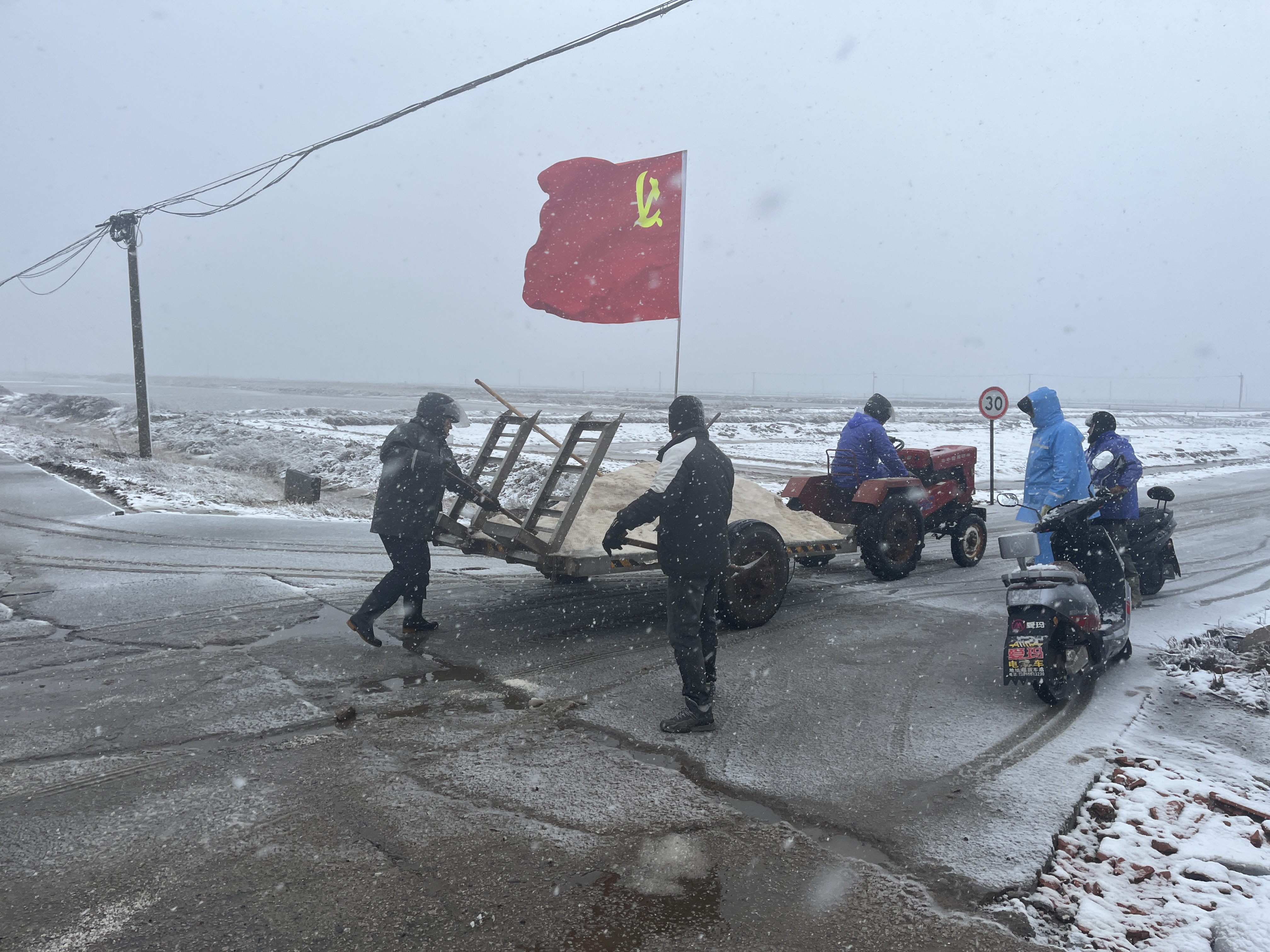 老黨員黃兆柱不惜班組產量,主動提供“融雪鹽”。祝星星、匡洪忠等不畏嚴寒、鉚足干勁,手拿鐵鍬撒鹽、鏟雪。同時,還積極組織大家清掃各自區域內積雪,共同守護職工出行安全。經過大家的努力,南北長約5公里的道路已全部撒上“融雪鹽”。下一步,新河支部黨員先鋒隊將密切關注天氣變化,全力保證職工上下班道路交通安全。