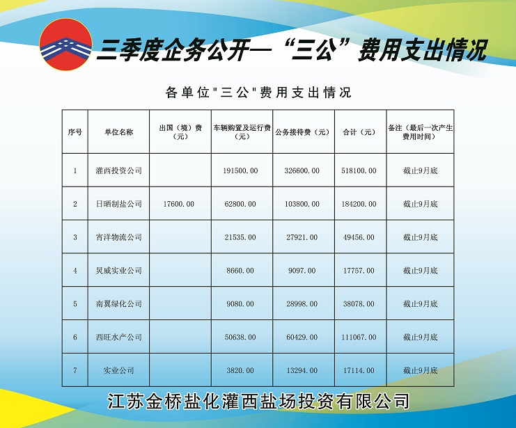 三季度,公司黨委積極做好走訪慰問、送溫曖工作,灌西鹽場投資公司、日曬制鹽公司對30名困職工發放陽光救助金30000元;對15名患重大疾病困職工及直系親屬發放救助金15000元;對26名困難大學生實行金秋助學金67000元。具體情況請查看公示展板。