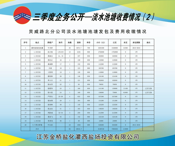 (二)淡水養殖池塘發包及費用收繳情況:共發包淡水養殖池塘210塊,面積21574.14畝,應收租賃費1420.5612萬元,已收租賃費1170.2558萬元,欠收租賃費250.3054萬元,收繳率為82.38%,正在加緊催收中。