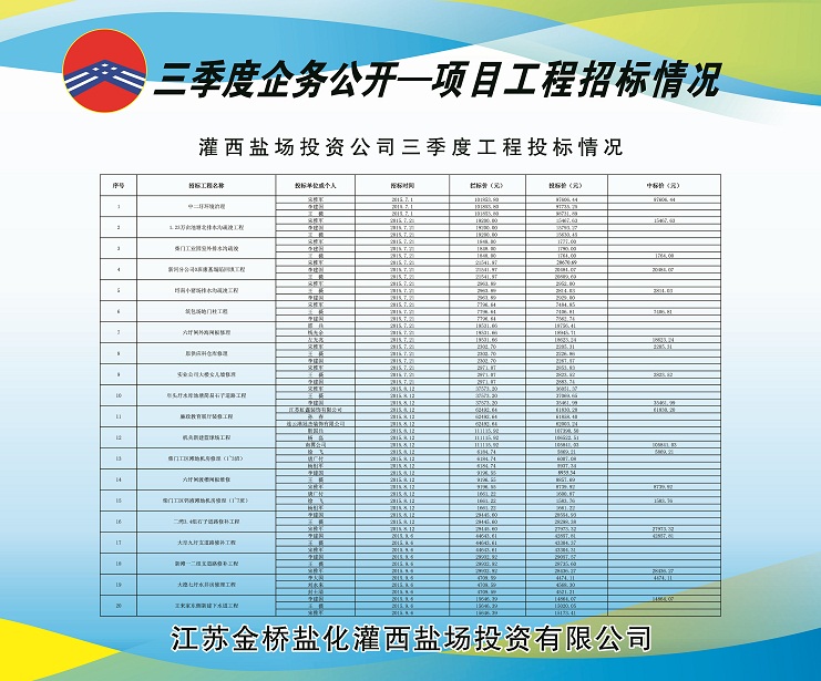 第二次是在7月21日,招標項目是:1、1.23萬畝池塘北排水溝疏浚工程,中標價為宋雅軍15467.63元。2、柴門工業園室外排水溝疏浚工程,中標價為王薇1764.00元。3、新河分公司0班廩基塌陷回填工程,中標價為李建國20484.07元。4、埒南小豬場排水溝疏浚工程,中標價為王薇2814.03元。5、筑包場地門柱工程,中標價為王薇7406.81元。6、六圩閘外海閘板修理工程,中標價為左廣兆18623.24元。7、原供應科倉庫修理,中標價為宋雅軍2205.31元。8、實業公司大樓女兒墻修理,中標價為王薇2823.52元。
