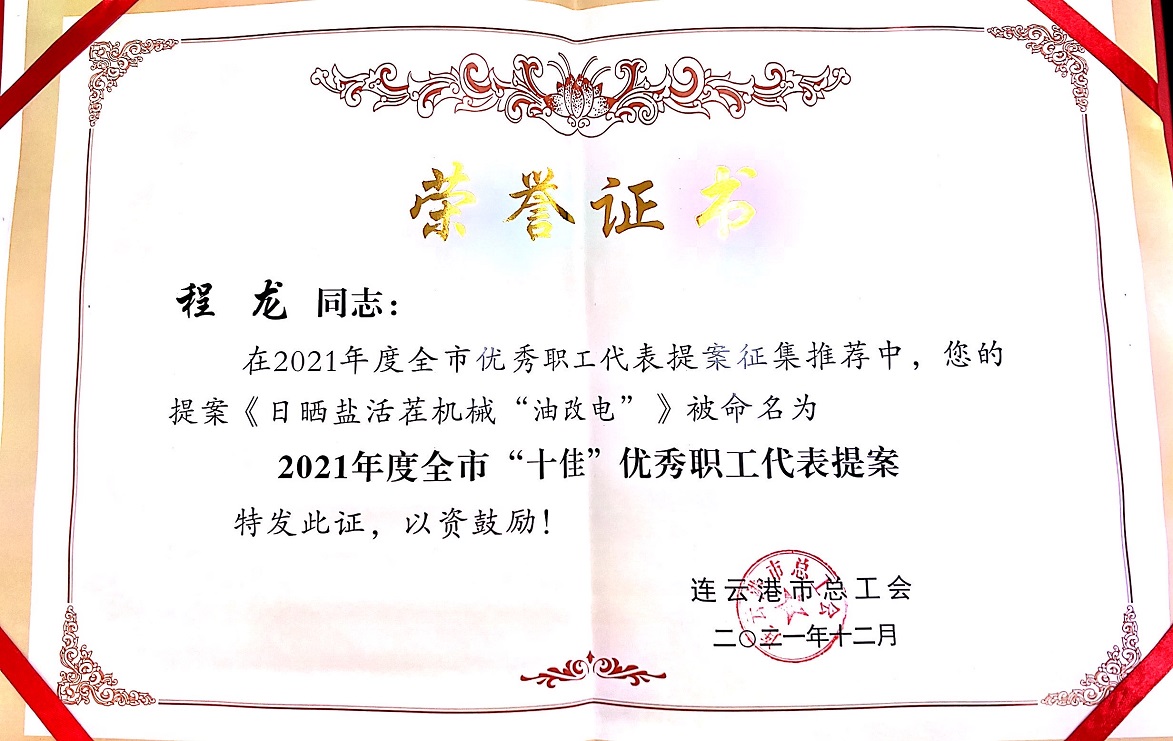 程龍的《日曬鹽活茬機械“油改電”》被命名為2021年度全市十佳優秀職工代表提案。(楊婕)