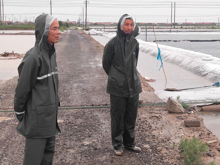 16日清晨,灌西投資公司常務副總經理吳衛平冒著暴雨親臨海水鹽基地檢查指揮防汛工作,并作出詳細防汛指導工作意見。