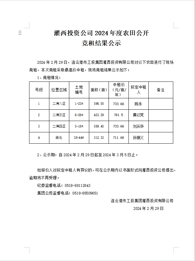 灌西投資公司2024年度農(nóng)田公開競租結果公示