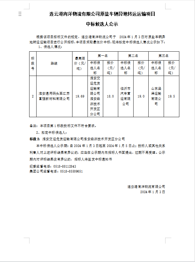 連云港宵洋物流有限公司原鹽車輛異地轉(zhuǎn)運運輸項目中標候選人公示
