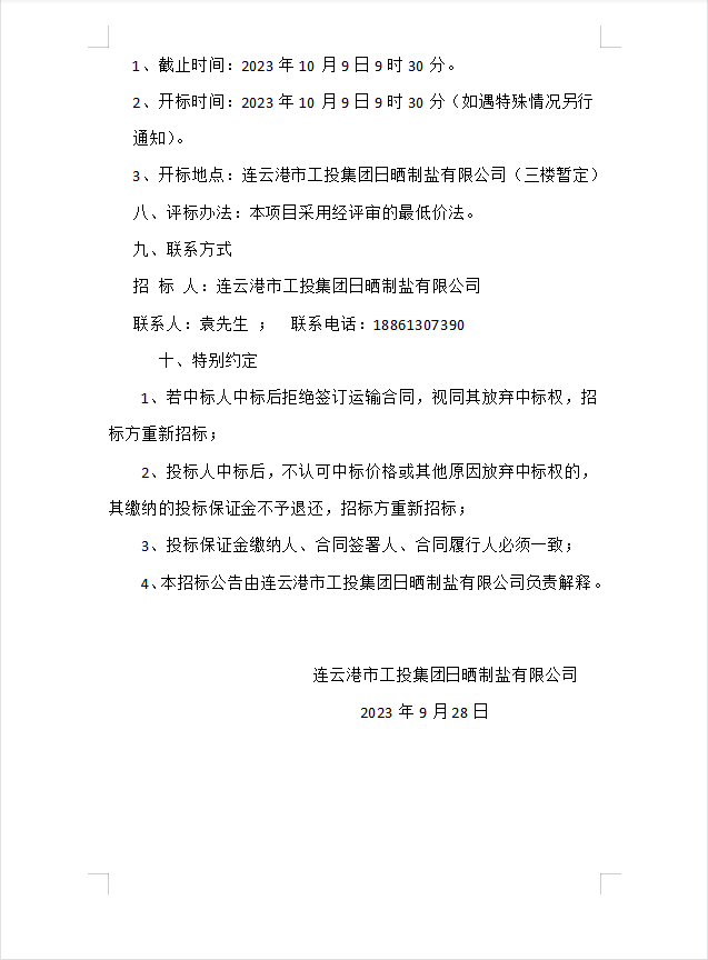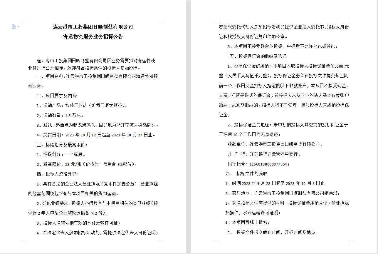 連云港市工投集團(tuán)日曬制鹽有限公司海運(yùn)物流服務(wù)業(yè)務(wù)招標(biāo)公告