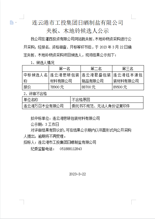 夾板、木地鈴采購候選人公示