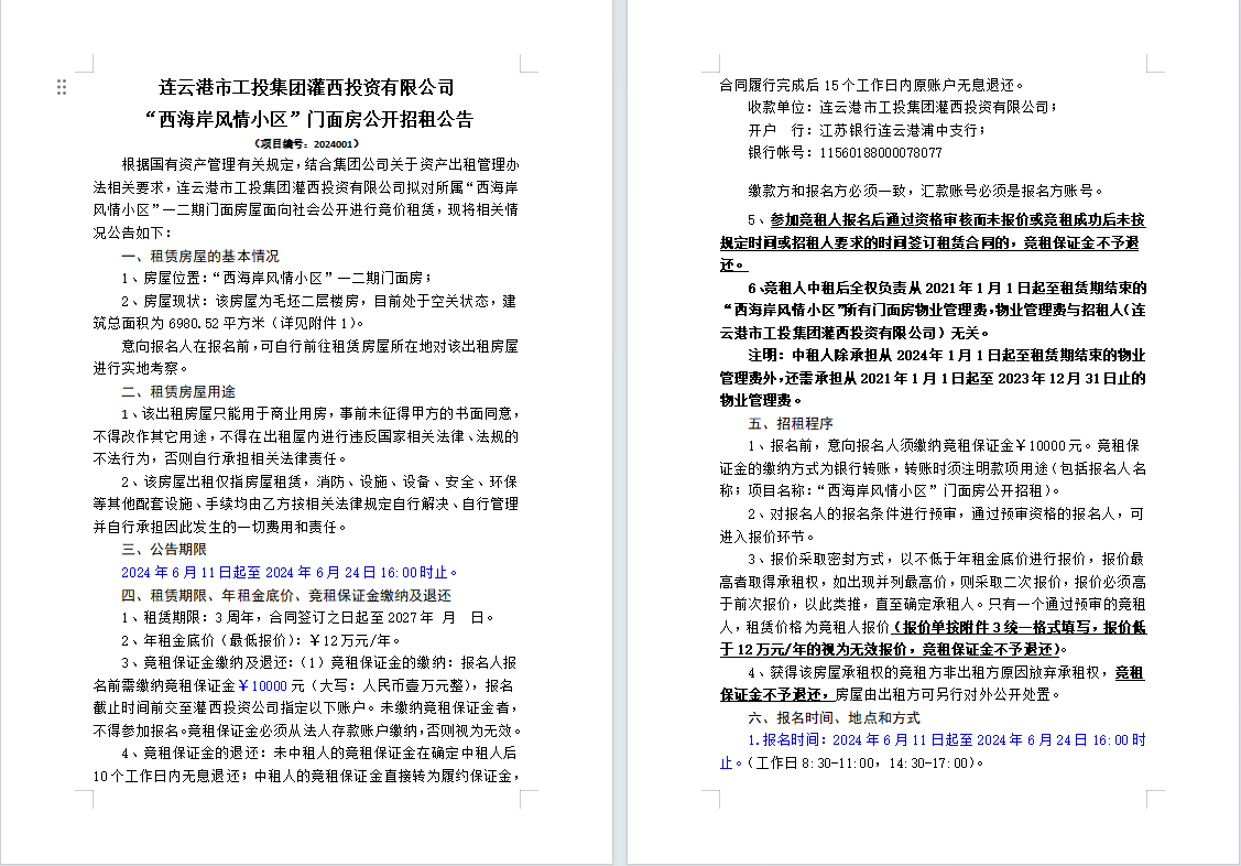 連云港市工投集團(tuán)灌西投資有限公司“西海岸風(fēng)情小區(qū)”門面房公開招租公告