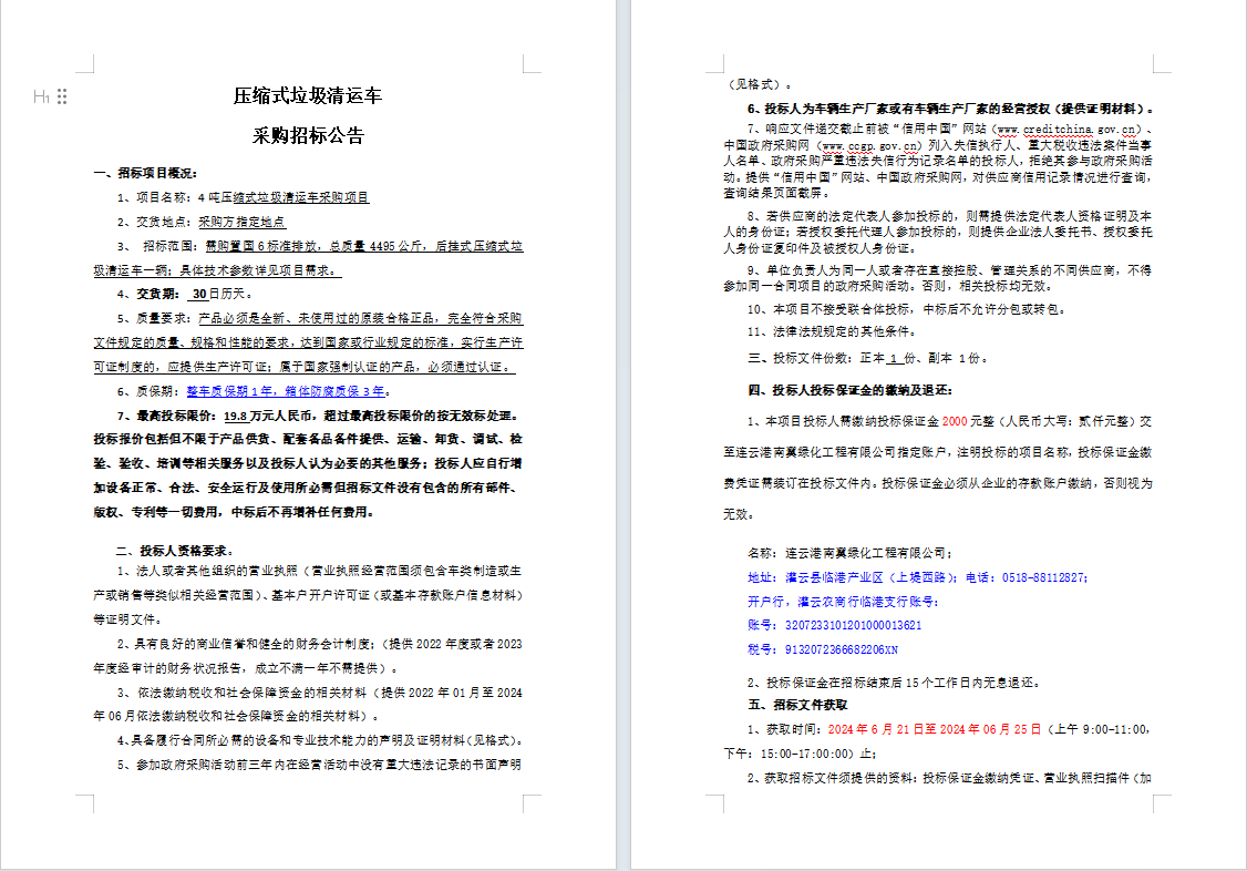 壓縮式垃圾清運車采購招標公告