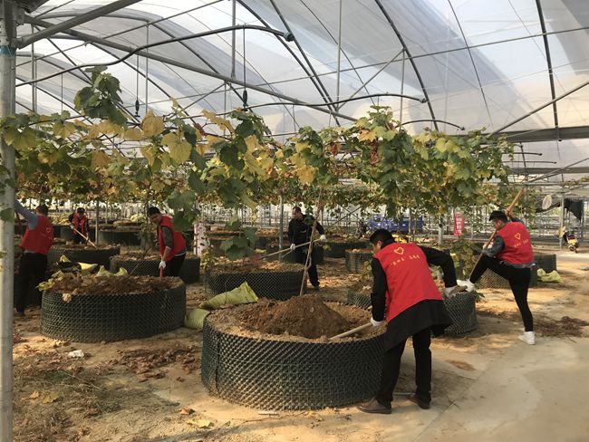 10月30日上午,青口投資公司團委組織團員青年前往育秧大棚參加志愿服務,對200株限根葡萄施用有機肥,為來年掛果豐收蓄力。 (團委)