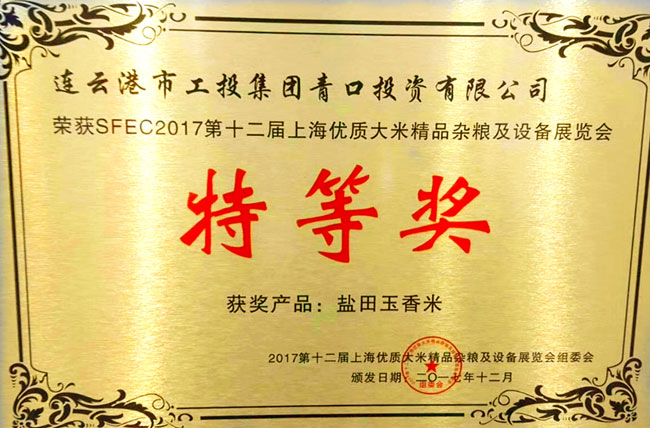 2017第十二屆上海優質大米及精品雜糧展覽會,我公司“鹽田玉”大米榮獲特等獎,這是繼江蘇好大米稱號之后的又一重大殊榮。
