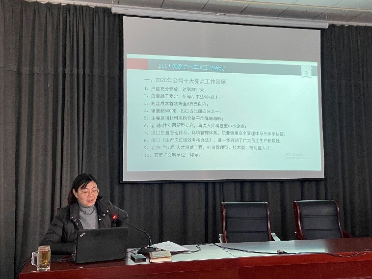會上,公司副總經(jīng)理王爽芳總結了2020年公司十大亮點工作,部署2021年生產(chǎn)重點工作。公司總經(jīng)理助理李洋總結了2020年生產(chǎn)車間管理工作,提出車間2021年“5S”管理目標。