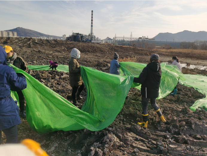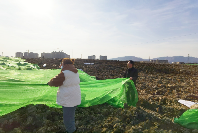 寒冷絲毫沒有降低大家的熱情,路面因為每天噴灑防塵導致潮濕泥濘,大家穿上雨靴,爬上爬下,一鼓作氣,經過兩天齊心協力的辛勤勞作,防塵網終于覆蓋完畢。遠遠望去,覆蓋綠網后的區域如同覆蓋了一片綠色植被。此次綠網覆蓋行動,不僅抑制了二次揚塵污染環境,保護了生態環境,同時達到了環境美化的效果。