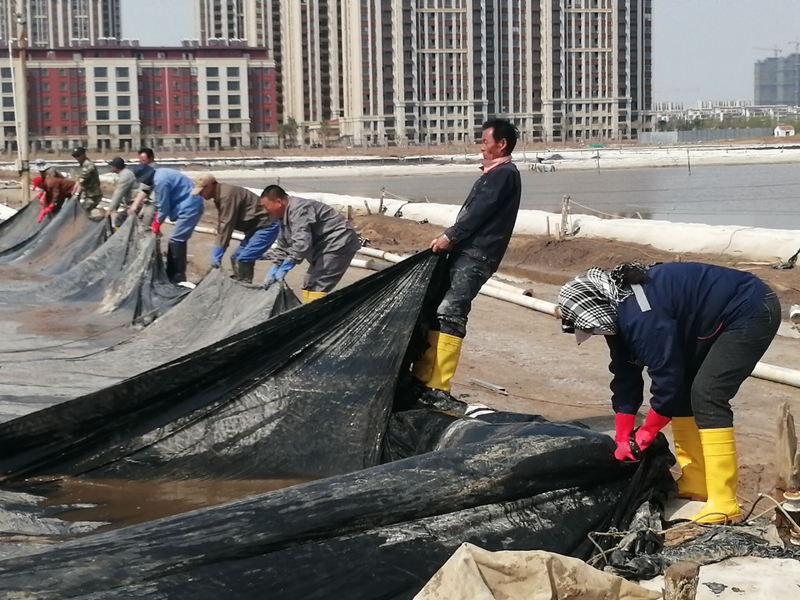 “一二三、起,注意塑布?jí)牡牡胤揭ゾo了”,在西灘組長(zhǎng)沈秀成的帶領(lǐng)下,大家正在清理塑布積水,一場(chǎng)暴風(fēng)雨過(guò)后,灘面積聚了大量雨水,擋浪布也損壞較多,為了不影響下一步的人工扒鹽,大伙迅速做好災(zāi)后修復(fù)工作,保住生產(chǎn)成果,確保顆粒歸倉(cāng)。