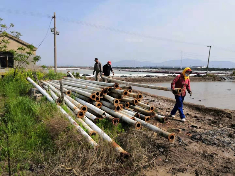 海濱工區(qū)一片繁忙景象,在凡平的統(tǒng)一指揮下,大家爭(zhēng)分奪秒的在往工具車上搬運(yùn)扒鹽管道和電纜,運(yùn)往先鋒西灘。先鋒西灘受臺(tái)風(fēng)影響,電線桿被刮到數(shù)根,等待供電所的修建得半個(gè)月,嚴(yán)重影響生產(chǎn)。海州灣公司在斷電的情況下,不等不靠想辦法,從海濱調(diào)度電纜,架設(shè)機(jī)泵,確保下一步人工扒鹽如期進(jìn)行。