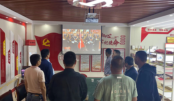 主題黨日活動在國歌中拉開了序幕。資產管理中心全體黨員列隊面向屏幕,觀看天安門廣場升國旗儀式視頻。